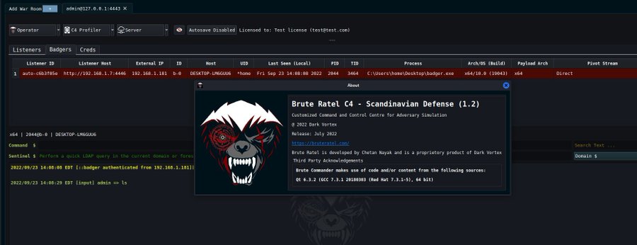 On 13 September 2022, an archive file called “bruteratel_1.2.2.Scandinavian_Defense.tar.gz” was uploaded to VirusTotal. This file contains a valid copy of BRC4 version 1.2.2/5.
